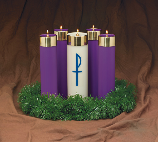 Brass followers are also included in this set which boasts an impressive 12” x 2 5/8” size for each candle, plus a 12” x 3 1/4” Christ candle featuring a special Chi-Rho symbol in blue adding distinctiveness to any table it is displayed on. (Greenery not included.)