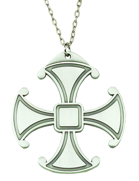 Polished from pewter and finished with a 30” rhodium chain, this 3” diameter beautiful cross comes with a convenient gift box for that special occasion.  It features a small square in the center, from which four arms extend wider on the outside so that the arms look like triangles which represent the Trinity, united in perfect harmony, and with its round wheel effect, it symbolizes setting into motion acts of love, service, and faith. Makes a great gift!