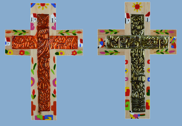 7" wooden cross featuring colorful, painted border with green metal cross in center.