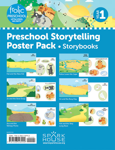 Each Bible story has a poster featuring the illustration on one side and a storytelling script on the other. Ten posters go with the ten New Testament stories for Frolic Preschool Sunday School. Poster dimensions: 11"; x 17"; folds to 8.5"; x 11".